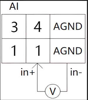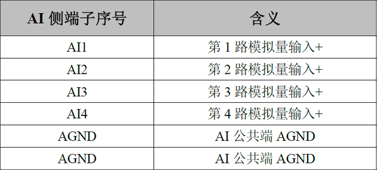 下方两排端子排的左侧为AI端子排,分别为AI1~AI4两个模拟量输入点,以及2个模拟量的公共端AGND接口(2个AGND口内部已短接),如图所示。AI及AGND端子对应的序号及其含义如表2.6所示。