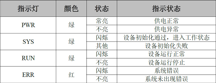 GCAN-PLC-221模块有两组指示灯,分别为系统状态指示灯和IO指示灯。系统状态指示灯具有1个PWR指示灯、1个SYS指示灯、1个RUN指示灯、1个ERR灯来指示设备的运行状态。