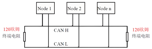 CAN-bus网络采用直线拓扑结构,总线最远的2个终端(CAN接口)需要安装120Ω的终端电阻;如果节点数目大于2,中间节点不需要安装120Ω的终端电阻。对于分支连接,其长度不应超过3米。CAN-bus总线的连接如图3.2所示。