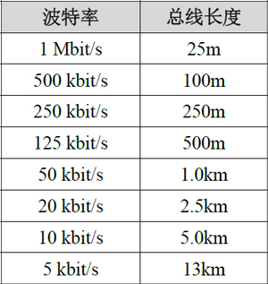请注意:CAN-bus电缆可以使用普通双绞线、屏蔽双绞线。理论最大通信距离主要取决于总线波特率,最大总线长度和波特率关系详见表3.1。若通讯距离超过1km,应保证线的截面积大于Φ1.0mm2,具体规格应根据距离而定,常规是随距离的加长而适当加大。
