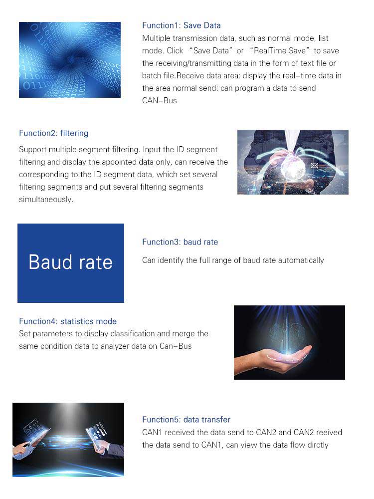 3. Support CAN2.0A and CAN2.0B, conform to ISO/DIS11898