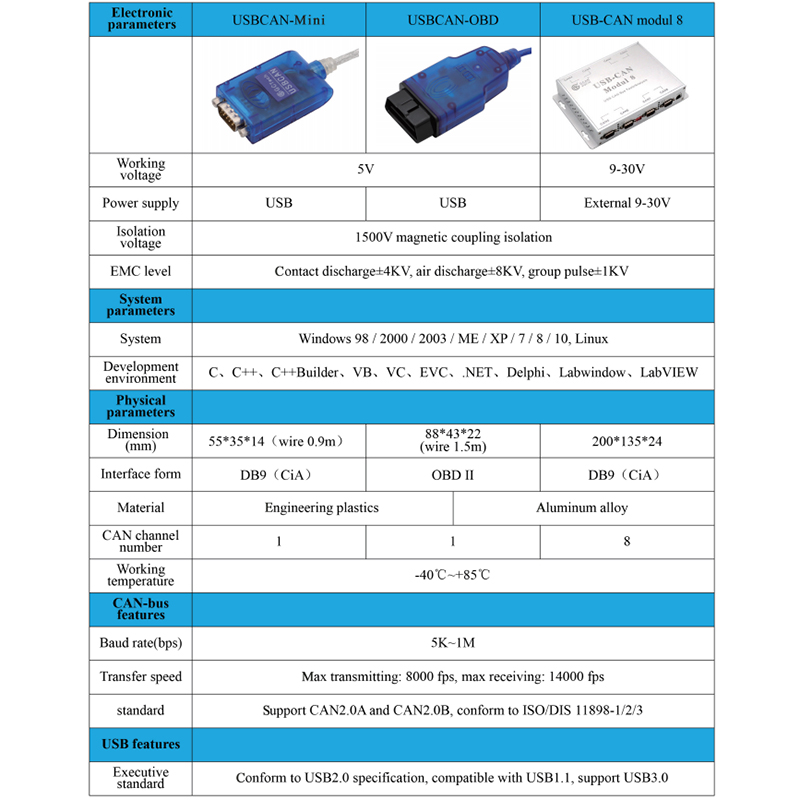 The USBCAN analyzer supports any CAN-bus standard or custom protocol, can use ECAN Tools, CAN Test, CAN Pro and other software, with the identification of baud rate, receiving and transmitting data, data storage and statistics, filtering and shielding, sending files, relay and offline, data triggering, DBC loading analysis, standard protocol analysis, drawing graphs and other practical functions. The flexible functions of USBCAN Analyzer can help engineers to complete the work better and faster.