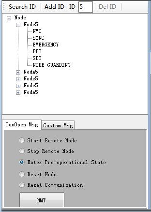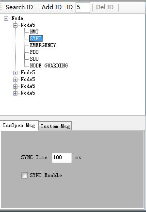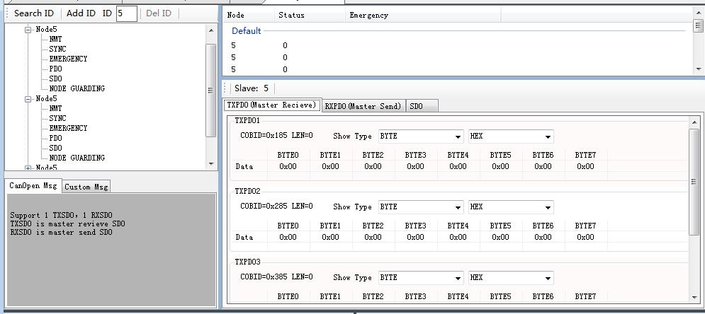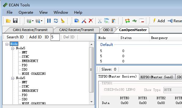 We can click on the left "Find slave station" to scan all CANopen slave nodes on the CAN bus. You can also add CANopen slave station manually. The station which is already been added will be shown as below. The user can double-click the specified node number to activate the interface to communicate with the slave station. The CANopen master station function turns the USBCAN device into a CANopen master card and accesses the CANopen network. ECANTools has a variety of commonly used CANopen master station function. For example, NMT(Network Management), SYNC(synchronous protocol), EMERGENCY(urgent message), PDO(process data object), SDO(service data object), NODE GUARDING(node protection).
