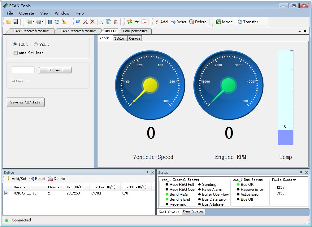 ECANTools is the software of USBCAN which are designed and developed by Shenyang Guangcheng Technology Co., Ltd.. ECANTools software has a lot of functions, such as data transmission and reception, data saving, automatic recognition of baud rate, statistics mode, senior shielding. ECANTools also supports car OBD analysis functions and CANopen master station. ECANTools supports standard system in WIN XP/WIN7/WIN8/WIN10/Linux.