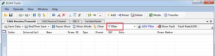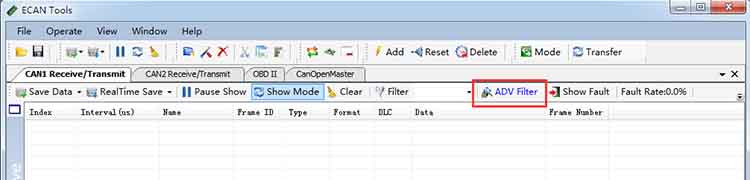 You can find the "ADV Filter" button in the Ecantools software interface, as shown below. Click the button to set the CAN shielding function. Easy and simple.
