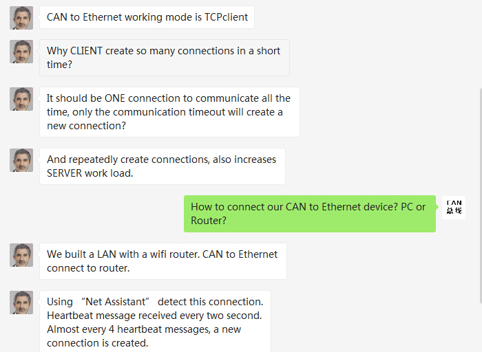 There is a user response. After the Ethernet to CAN device successfully configured, multiple port numbers appeared when debugging with “Net Assistant”. The reasons for this phenomenon are mostly poor network environment, frequent dropped calls, etc. When the slave device re-establishes the connection, a new port number will be generated. Below I summarize the recent cases, multiple ports appear in “Net Assistant”. The reason and solution.Mr Andre, an engineer from a company in Hawaii, USA, contacted me: After configuring GCAN-202 use “TCPclient” working mode, there are multiple port numbers in the software client column when the computer “Net Assistant” is connected, about every two minutes. A new port appears, as shown in the following figure.