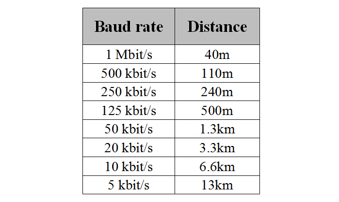 As can be seen from the above table, the CAN bus theory has a maximum communication distance of up to 13Km, but under the premise that the baud rate is only 5K, the bandwidth is relatively small and cannot be used in a system with a large amount of data.