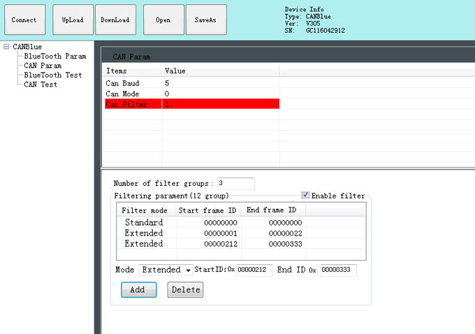 Bluetooth to CAN device GCAN-203 filtering function display page