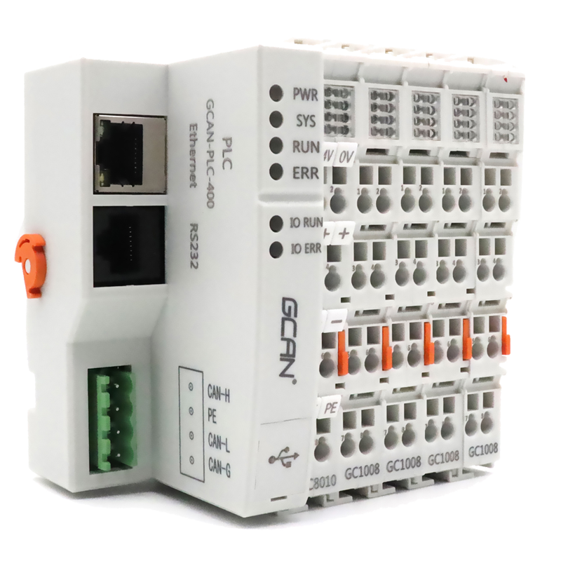Shenyang Guangcheng Technology GCAN-PLC is composed of a programmable main control module (GCAN-PLC-400), several GC series IO modules (GC-1008, GC-3804, etc.) and a terminal terminal module. The GCAN-PLC-400 main control module can be connected to all GC series IO modules. The user can choose to expand the IO module according to the actual needs of the site. The number of expansion IO modules can reach 32. The GCAN-PLC-400 main control module supports automatic configuration, users do not need to set parameters on the PC, the main control module will be automatically configured according to the front and rear positions of the inserted terminal module.