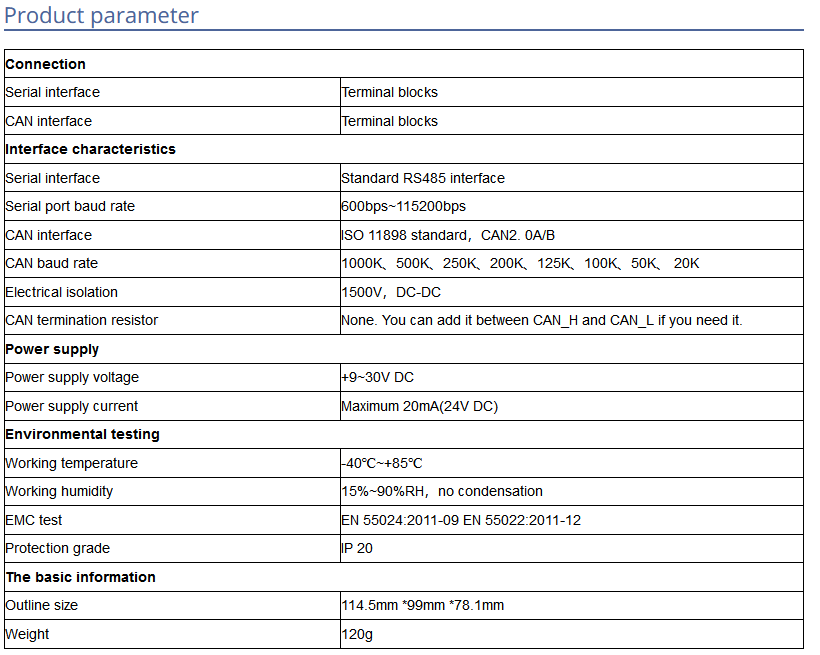 Can connect CAN bus communication equipment to Modbus network for centralized collection/control.