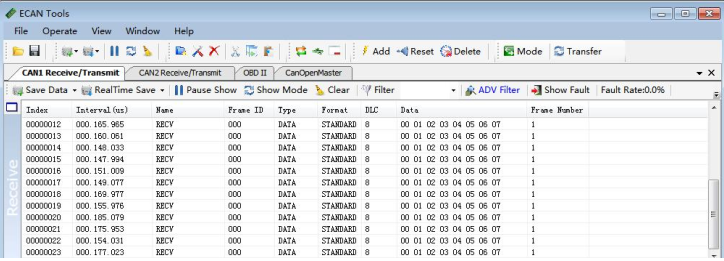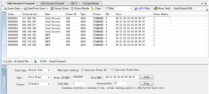 Transmitting and receiving is the basic function of ECANTools, in this interface, users can directly see the received CAN data, and sent the data to CAN-bus.