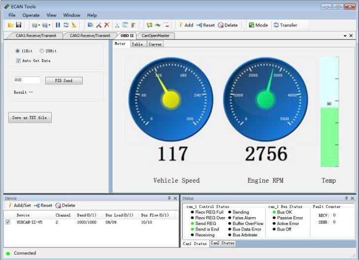 The USBCAN-OBD can use the auto signal resolution function of ECANTools software.