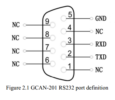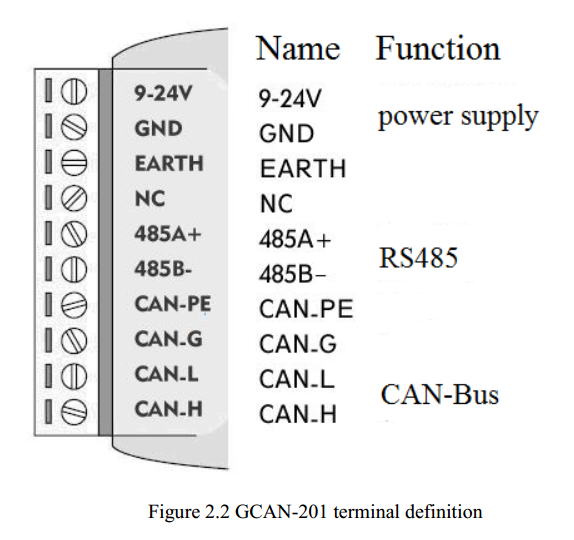 GCAN-201 converter port definition as shown in figure 2.1 and figure 2.2, using the terminal and the RS232 port, for industrial field application.