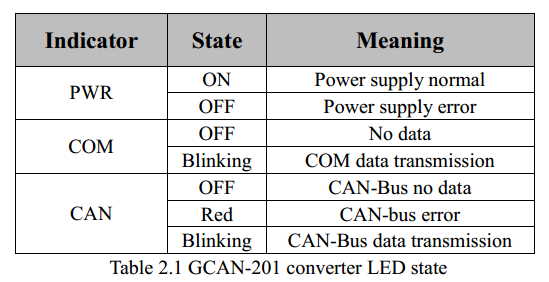 GCAN-201 converter with one PWR indicator, one COM indicator, one CAN indicator to indicate the converter status. More functions are shown in table 2.1.