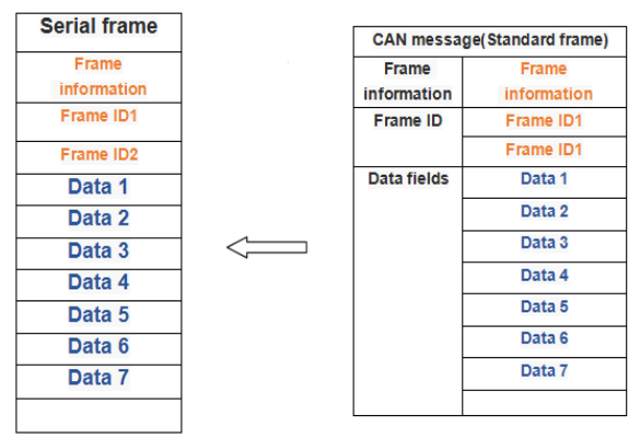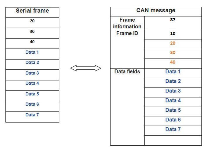 E.g.: If the CAN frame ID starting position address is 1, the length is 3 in the Serial frame( Extension frames) . Conversion is shown as Figure below.