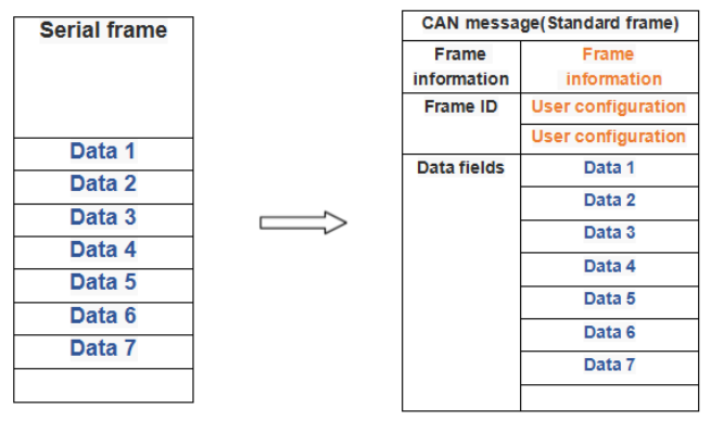 E.g. Serial data 11 22 33 44 55 66 77 88 converts to CAN-Bus. Frame ID is the configuration for“发送标识符” which users have set. Frame data is 11 22 33 44 55 66 77 88.