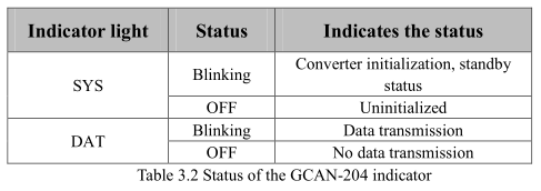 GCAN-204 converter has one SYS indicator, one DAT indicator that can indicate the converter status. More functions are shown in table 3.2.
