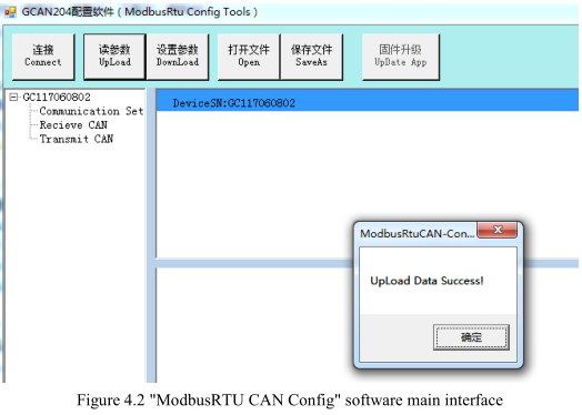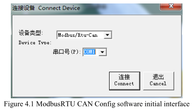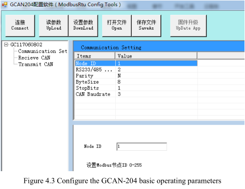 When GCAN-204 enters the configuration mode, use a RS485 line to connects to PC. Open the "ModbusRTU CAN Config" software, then configure the parameters. The software interface is shown in figure 4.1.