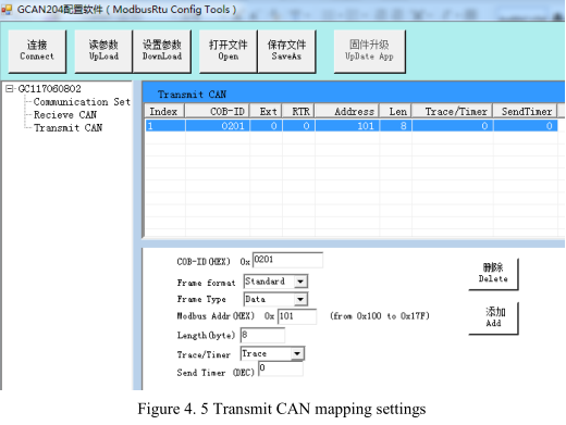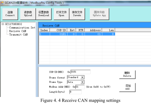 Press "Add" to add data. "Receive CAN" Modbus address: 0x00-0x7F, Modbus address of Transmit CAN: 0x100-0x17F.