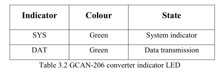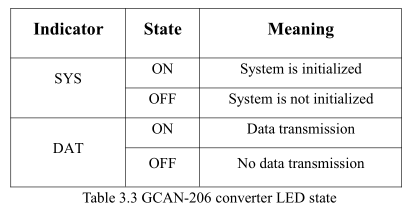 GCAN-206 converter with one SYS indicator to indicate the converter status. One DAT indicator to indicate data transmission. More functions are shown in table 3.2 and 3.3.