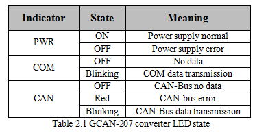 GCAN-207 converter with one PWR indicator, one COM indicator, one CAN indicator to indicate the converter status. More functions are shown in table 2.1.