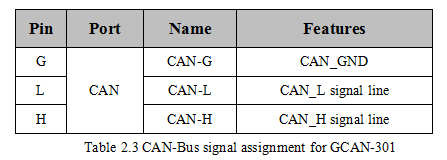 The pin definitions for the CAN side of GCAN-301 are shown in table 2.3.