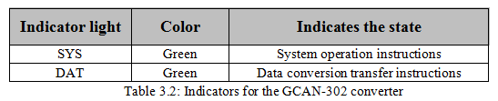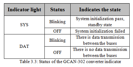 GCAN-302 converter has one SYS indicator, one DAT indicator. More functions are shown in table 3.2.