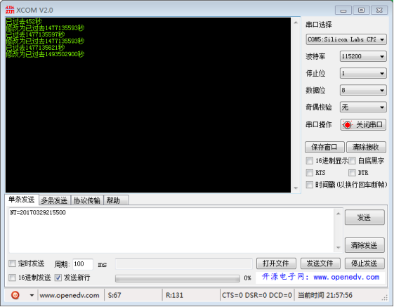 (serial port baud rate: 115200, data bits: 8, stop bit: 1, parity bit None, instruction is: "NT = XXX". For example: send "NT = 20170329215500", will amend the system time to March 29, 2017 21:55:00. Please note that, send and receive in ASCII and select "send new line", don't choose "hex".)