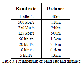Note: the CAN-bus cable can use ordinary twisted-pair cable, shielded twisted-pair cable. Theory of the maximum communication distance depends on the bus baud rate, Their relationship as shown in the Table 3.1.