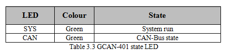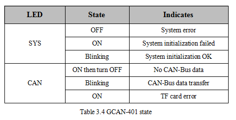 GCAN-401 adapter with one SYS indicator, one CAN indicator to indicate the adapter status. More functions are shown in table 3.3 and 3.4.