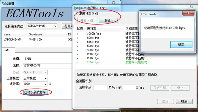 软件可以自动识别波特率,当用户在不知道总线波特率的时候,自动识别波特率功能会对用户有极大的帮助。识别波特率分为两种模式:标准波特率识别(通用波特率如1000K、800K、500K等)、全范围波特率识别(设置识别范围,全面匹配)总线分析功能