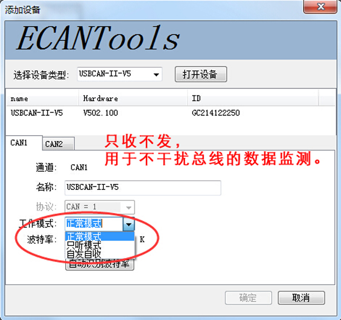 智能滤波功能不再需要计算复杂的屏蔽码和验证码,只需简单的设置你需要过滤显示的ID或ID段即可对应接收。比如设置接收ID从100到200,那么只需在滤波设置界面输入100-200,则系统只接收100-200ID的数据。滤波段可设置多个并可同时使用。总线监听模式