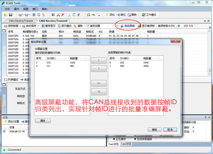 软件接收可以屏蔽指定的帧数据。可以将接收到的数据按帧ID归类后合并显示在左侧的待屏蔽列表中,从左边的列表中选择您需要屏蔽的帧ID,点击向右箭头即可将选中的帧ID添加到屏蔽列表中,软件将自动屏蔽所有在右侧列表中所有以此帧ID开头的所有数据,屏蔽列表可以设置多条。此功能非常便于汽车CAN数据抓取,可以屏蔽怠速状态下的所有数据后直观的看到新增加的数据,用于判断数据作用。请注意:CANCore-I为1条CAN总线的模块,仅有CAN1可用;CANCore-II为2条CAN总线的模块,CAN1、CAN2均可用。